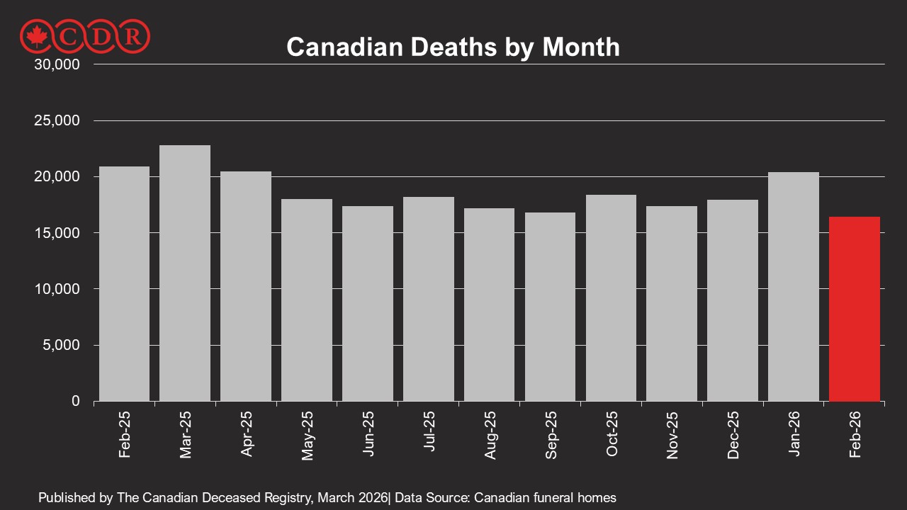 In February 2026, the Canadian Deceased Registry identified 16,434 confirmed deaths nationwide.