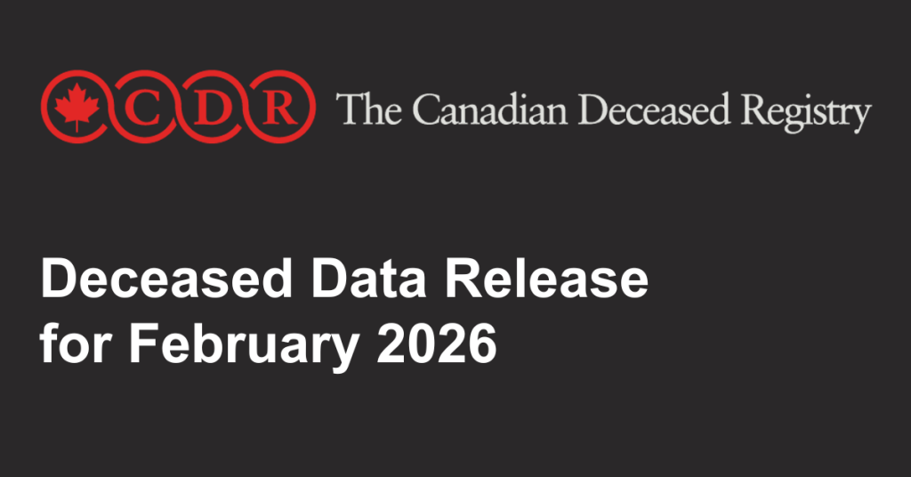 Each month, the Canadian Deceased Registry tracks confirmed deaths across Canada. This data underpins critical functions in data hygiene, fraud prevention, regulatory compliance, and customer experience — helping organizations avoid sensitive errors and operational risk.